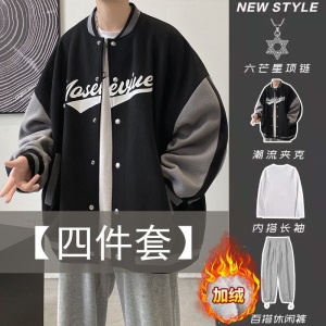杫木棒球服外套男春秋季宽松百搭夹克男青少年港风潮流帅气休闲一套衣服男士男装运动三件套 T104蓝夹+E00白t+K20灰裤 56 XL 105斤-140斤