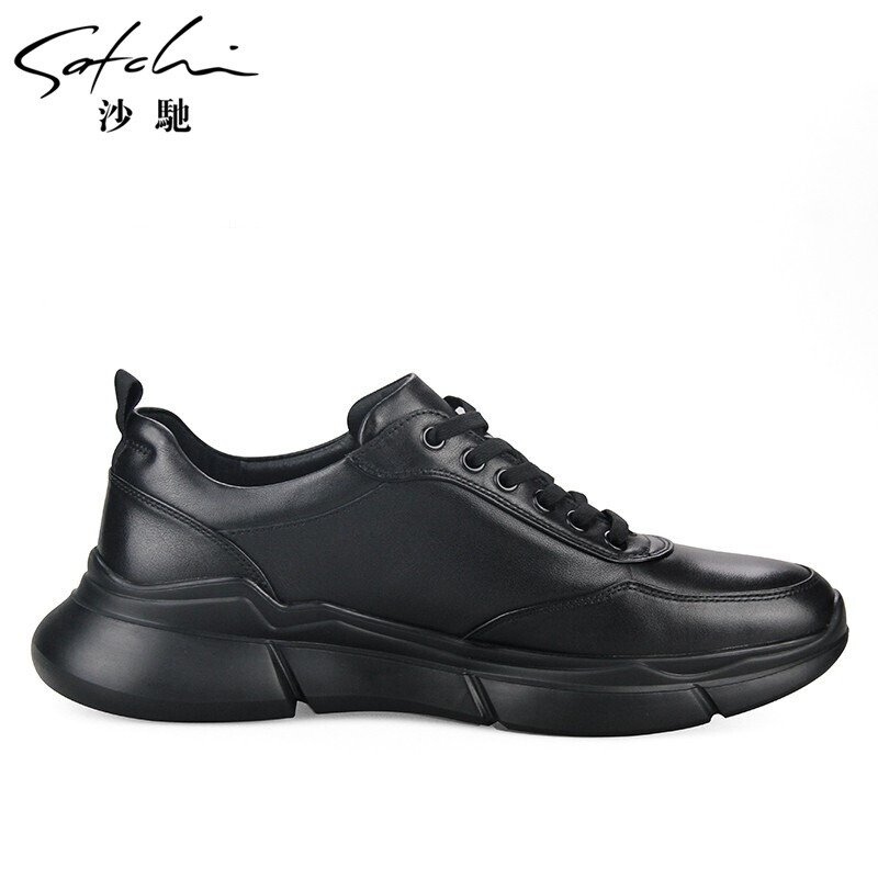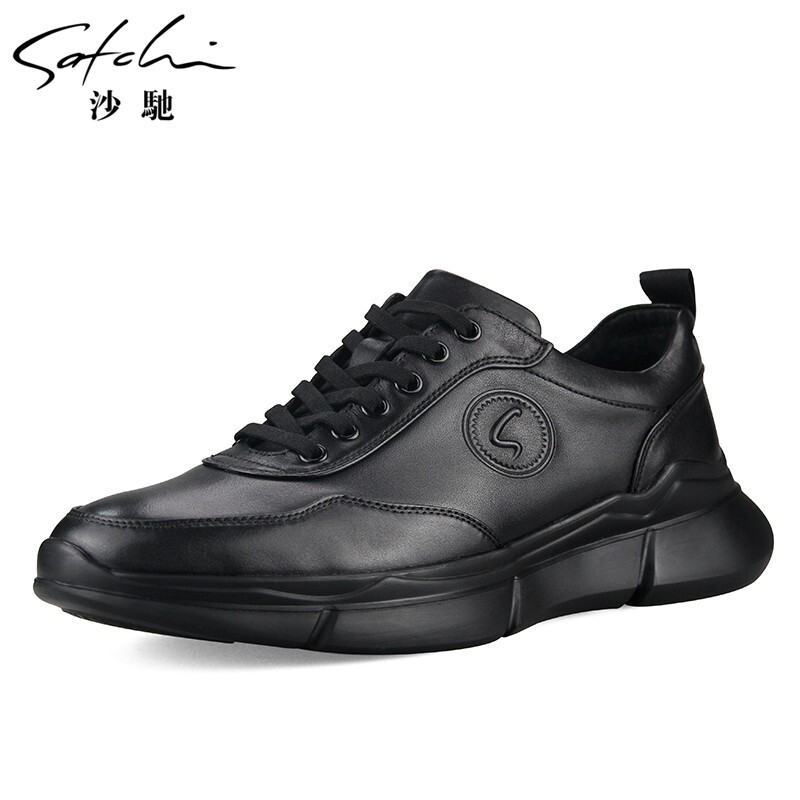 沙驰男鞋英伦商务休闲鞋男士低帮圆头系带舒适透气牛皮皮鞋 黑色202062008Z 44