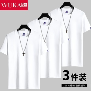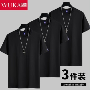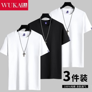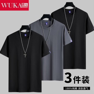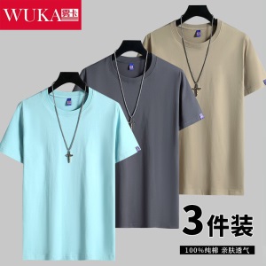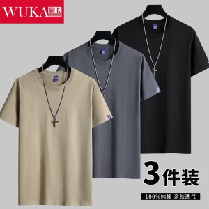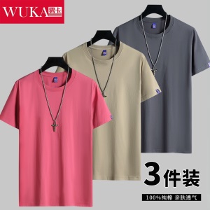 雾卡【纯棉3件】短袖t恤男纯棉半截袖衣服纯色圆领休闲宽松潮流男生胖青年大码男士新品夏季汗衫 西瓜红+卡其+黑