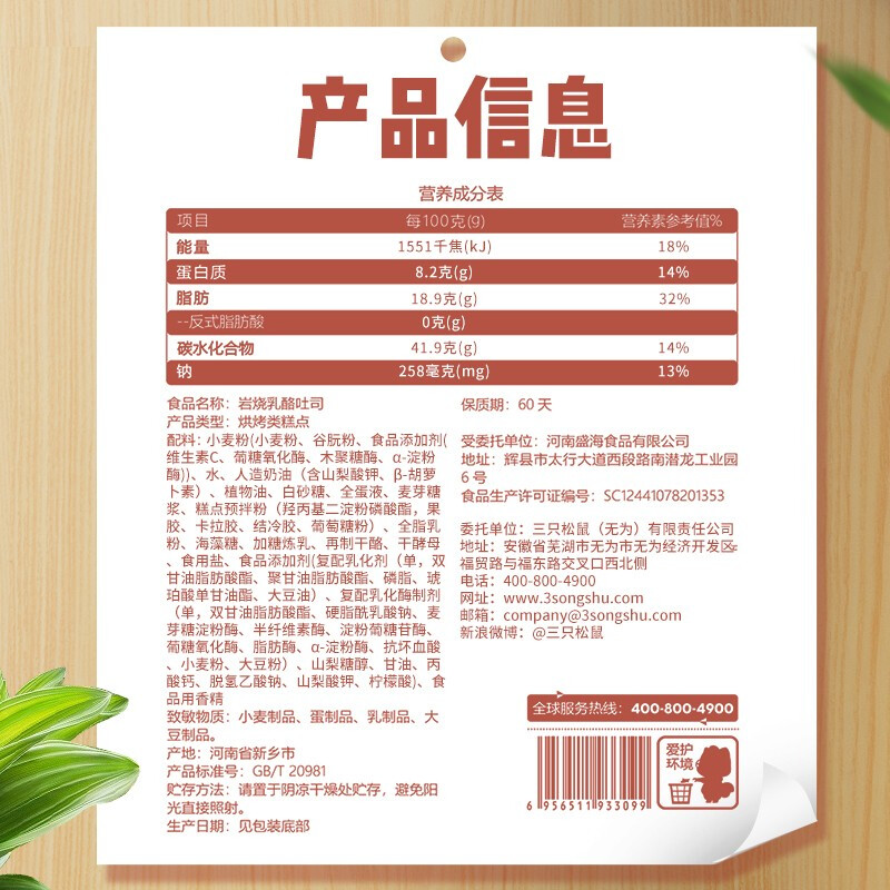 商品名称:三只松鼠岩烧乳酪吐司